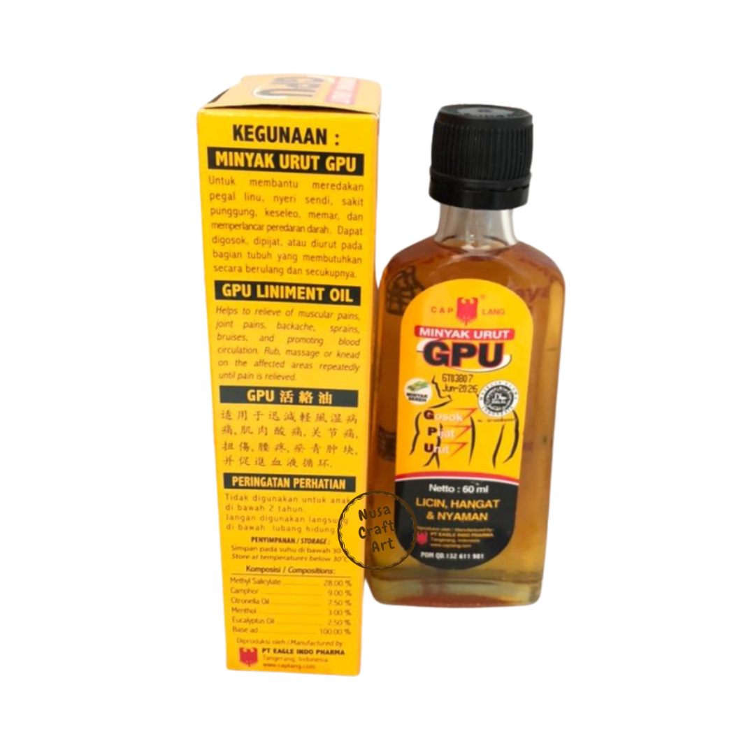 GPU CAP LANG EAGLE BRAND MASSAGE OIL is also suitable for use by athletes to warm up, reduce pain and tension after exercise or other physical activities that require great exertion. In addition, GPU CAP LANG EAGLE BRAND MASSAGE OIL is also recommended as a massage oil for masseurs.