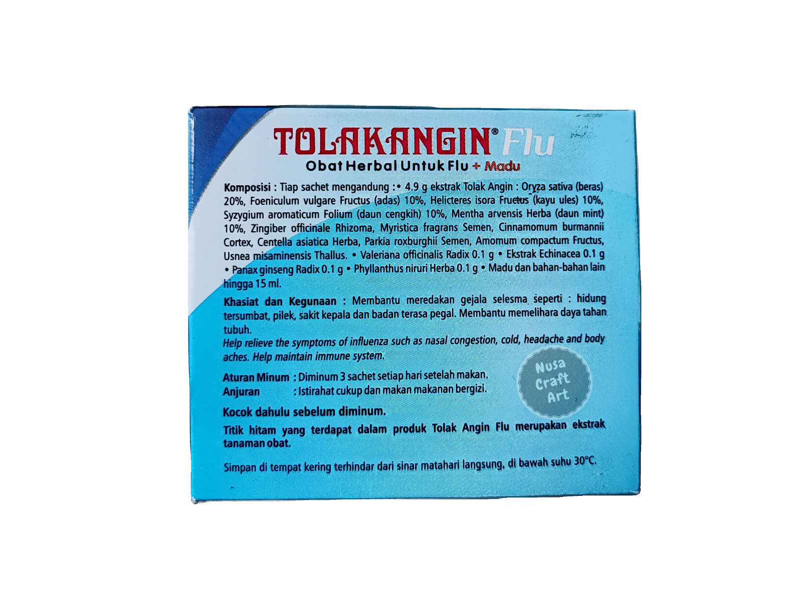 Tolak Angin Flu is a herbal medicine produced by factories that have GMP (Good Manufacturing Product) standard, ISO (International Organization of Standardization), and HACCP (Hazard Analysis Critical Control Point).